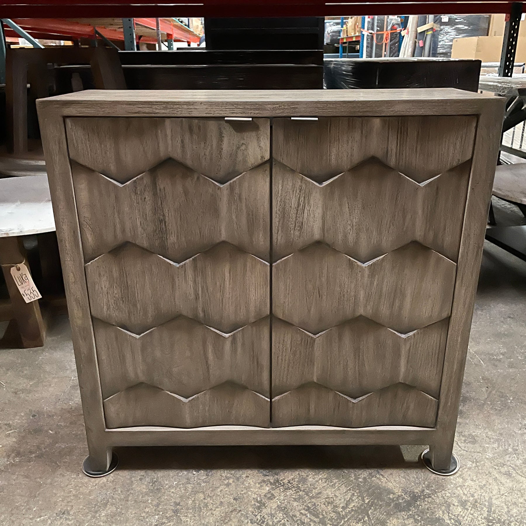 Expert craftsmanship is displayed in the 3-dimensional honeycomb striped doors in smoked ivory finished mahogany wood with antique bronze iron handles. Includes one adjustable interior shelf!